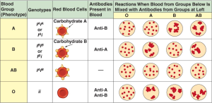 Blood is classified based on the presence or absence of two antigens (A and B), and an additional antigen called the Rh factor. This leads to eight possible blood types: